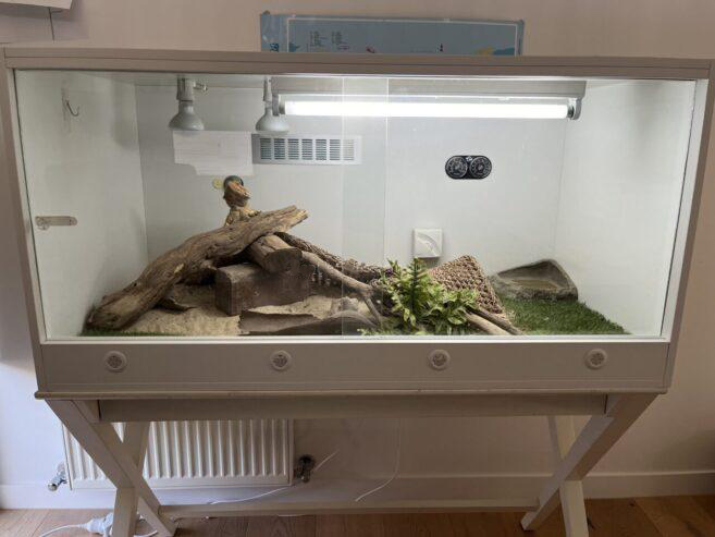 Package includes enclosure (120x60x60cm), all accessories including spare globes, supplements (gutload and superfood for feeding) and the table the enclosure is sitting on.