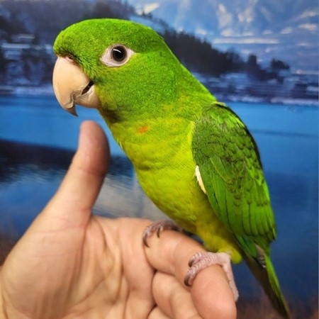 “Kiki” 18 month old Not sexed yet Green Conure (Psittacara holochlorus ) AKA Mexican Green Conure PLEASE NOTE: yes, I know its not a Hyacinth Macaw but Birdbreeders didn’t have a category for this species… oh well… smile very uncommon species to find available Captive bred, Solid banded Very smart species.