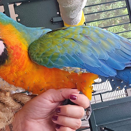 All our birds are lovingly handfed, well socialized (around other pets also) and fully weaned before going to their new home. Babies are DNA sexed and fully disease tested. They are weaned to a pellet (mix of Tops, Psittacus, and Zupreme) veggie and fruit diet.